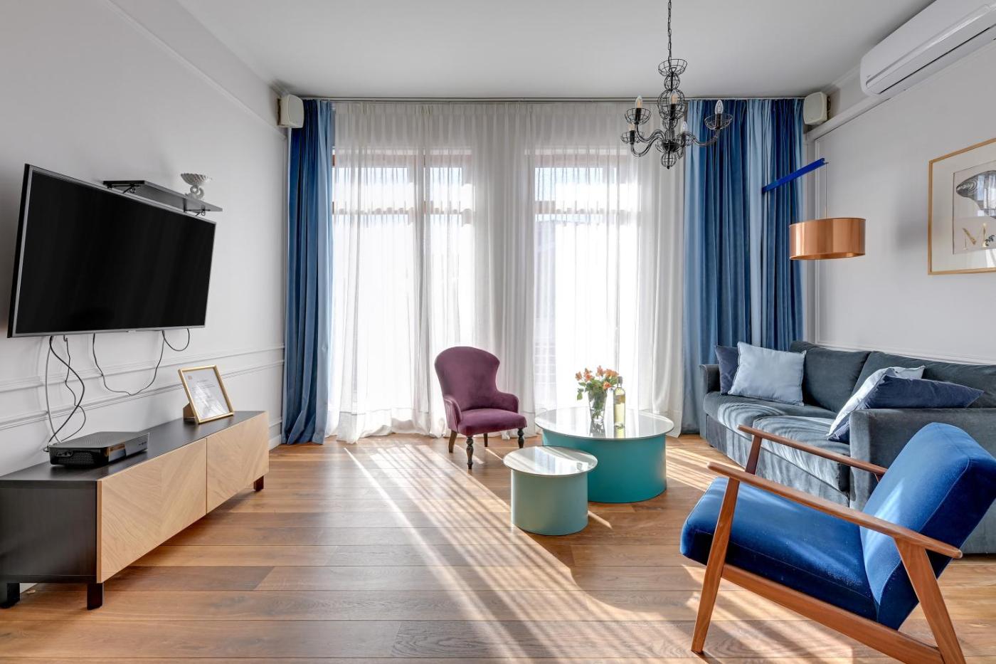 Apartament typu Deluxe. This air-conditioned apartment includes 1 living room, 1 separate bedroom and 1 bathroom with a bath. Guests can make meals in the kitchenette that is fitted with a stovetop, a refrigerator, a dishwasher and kitchenware. Boasting a terrace, this apartment also offers a washing machine, soundproof walls and a flat-screen TV with cable channels. The unit has 2 beds. Apartament - 4 osobowy. Powierzchnia pokoju ok.: 55 mkw.
